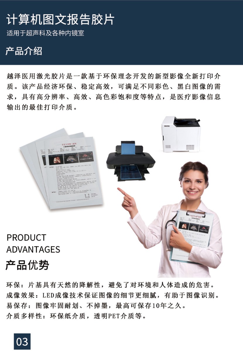 YZ醫(yī)用膠片是一款基于環(huán)保理念開發(fā)的新型影像全新打印介質。該產(chǎn)品經(jīng)濟環(huán)保、穩(wěn)定高效,可滿足不同彩色、黑白圖像的需求,具有高分辨率、高效、高色彩飽和度等特點。是醫(yī)療影像信息輸出的更佳打印介質。目前已廣泛應用于超聲科、婦產(chǎn)科、眼底、喉鏡、胃鏡、腸鏡、陰道鏡以及放射科等各大科室,是臨床醫(yī)學影像成像的更佳選擇。